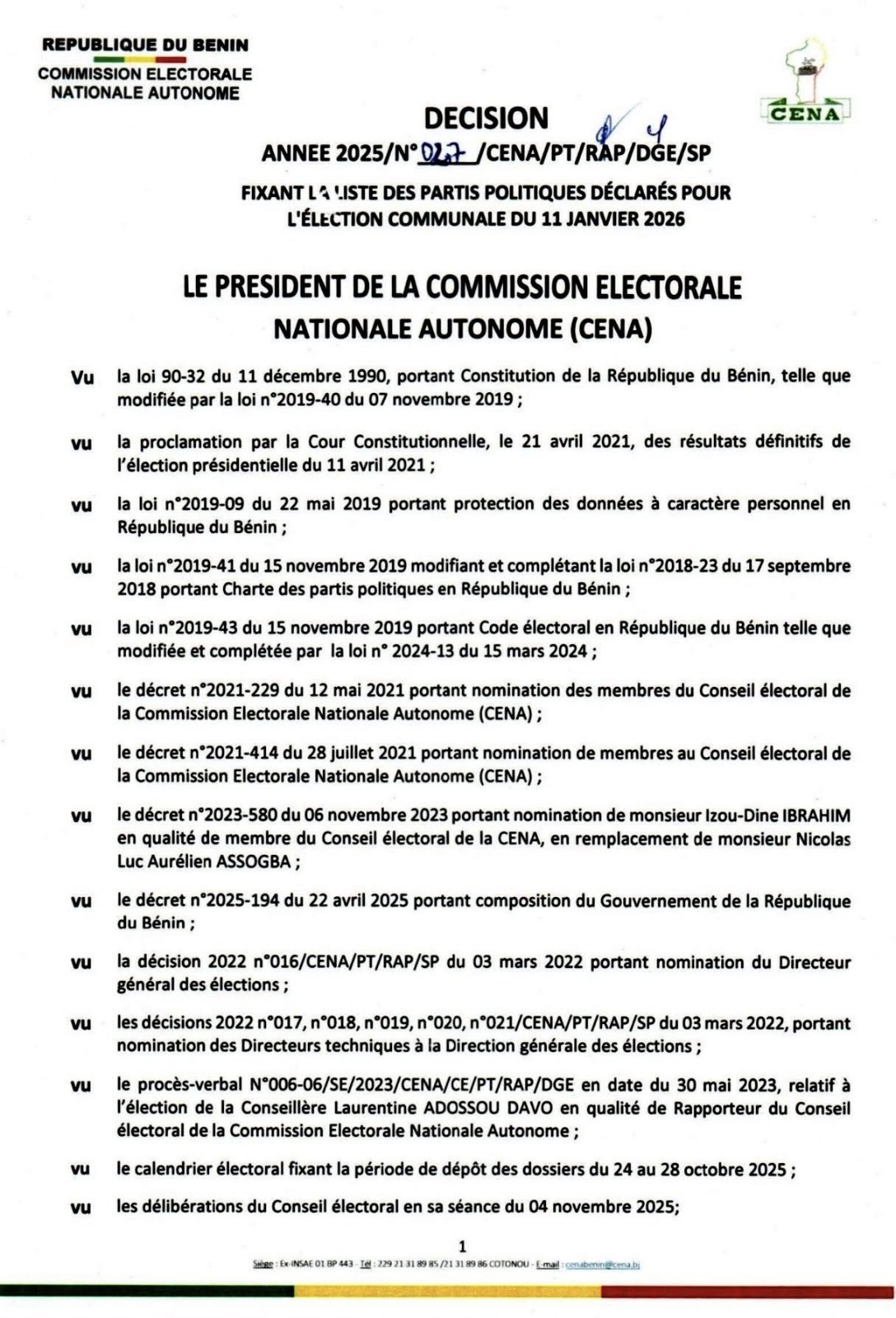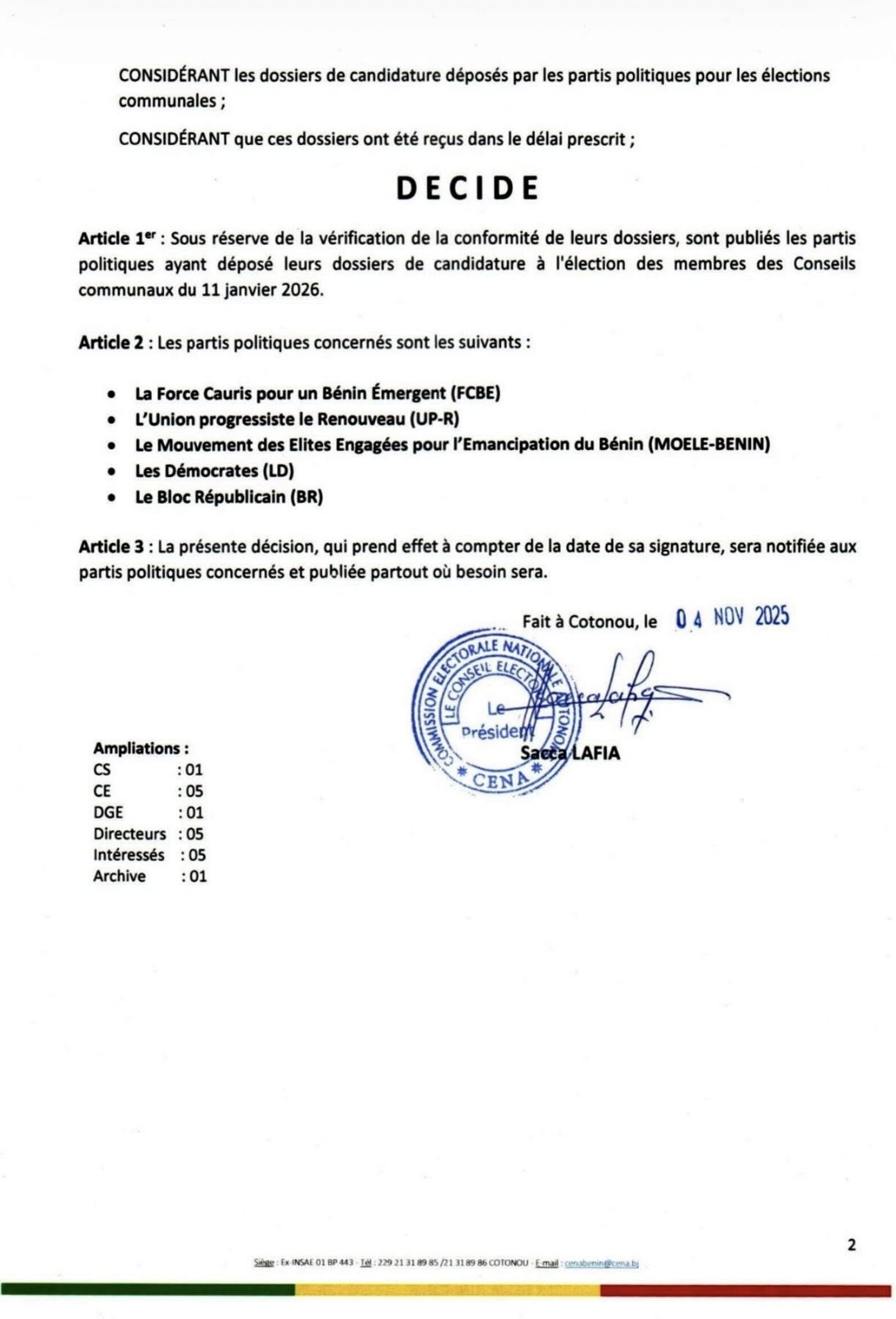 La Commission Électorale Nationale Autonome (CENA) a publié ce mardi 4 novembre 2025 la liste des partis politiques ayant déposé leurs dossiers de candidature pour les élections communales prévues le 11 janvier 2026, sous réserve de la vérification de leur conformité.