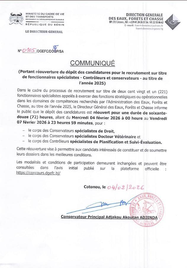 Selon la note signée du Conservateur principal Adjakou Adjinda, le dépôt des candidatures est réouvert pour une durée de 72 heures, à compter du mercredi à 00 heure au vendredi 7 février 2026 à 23h 59 minutes.