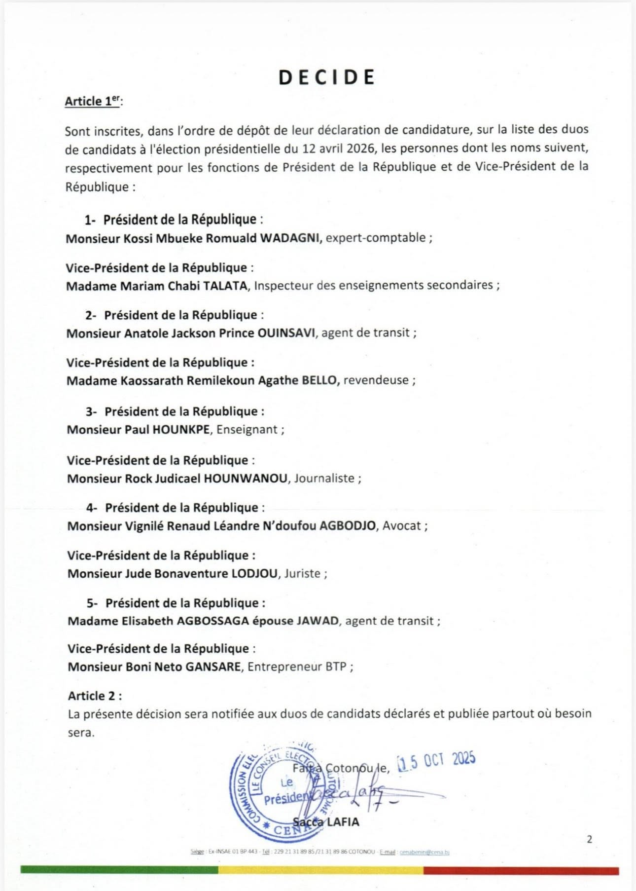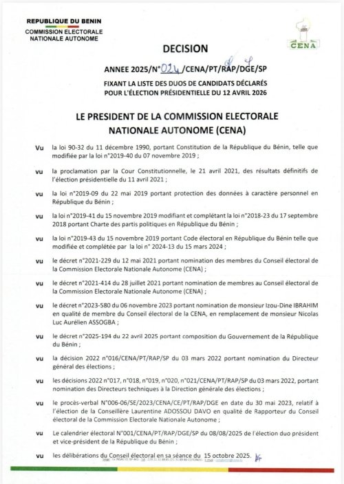 Au Bénin, la Commission Électorale Nationale Autonome (CENA), a publié ce jeudi 16 octobre 2025, la liste officielle des duos de candidats déclarés à la présidentielle du dimanche 12 avril 2026. Au total, cinq duos ont été déclarés comme l’indique le communiqué de la CENA ci-dessous.
